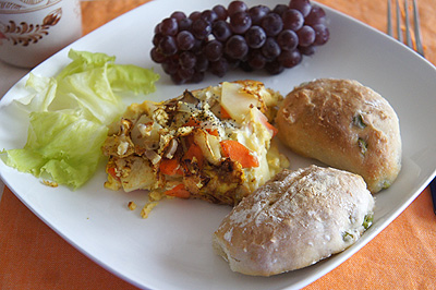 じゃがいもやたまねぎ、にんじん、エリンギを、卵液、チーズ塩胡椒で包んで焼いたオムレツ。