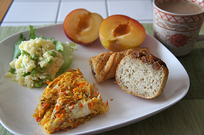手前のオムレツは、にんじんと玉ねぎのみじん切り、チーズ、マヨネーズ入り。