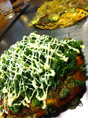 シンプルなそば・肉に、1枚はネギ、もう1枚はチーズのトッピングをしました。