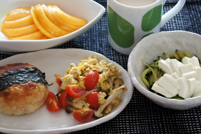 和風のパンなので、おかずも、なんとなくプチトマトとしめじの卵とじも出汁醤油で、