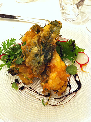 私の前菜は、穴子のフリット キュウリとモロヘイヤのタルタル添え。