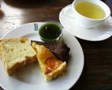 左からミントのシフォンケーキ、杏のタルト、豆腐のショコラ、そして抹茶ムース