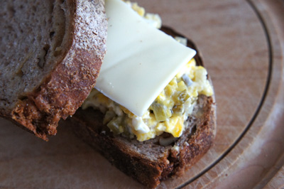 炒り卵とピクルスの入ったポテトサラダとスライスチーズをサンドしたもの。
