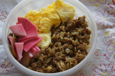 タマネギとエリンギを使ったドライカレーと、ゆったりとかき混ぜて焼いた卵。