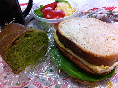 右は、おなばけ全粒粉パンに、スライスチーズとサラダ菜と薄焼き卵をサンドしたもの