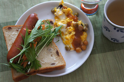 ミックスビーンズが入ったスクランブルエッグは、Oisixで購入したトリイの野菜と果物の完熟ソース。