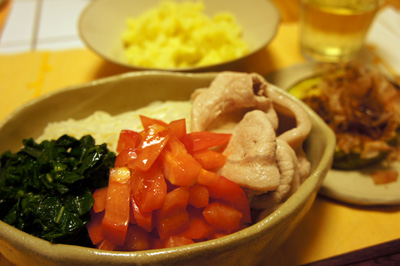 今日はトマトと茹でたモロヘイヤを刻んだものと、豚ロース肉を日本酒と共に茹でたものを