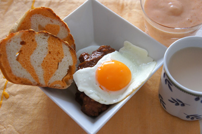 目玉焼きも黄味が固まるか固まらないかくらいの状態でトッピングして、好きなタイミングで崩して食べます。