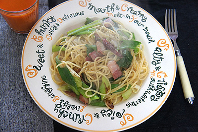 年末の家事の合間のランチは、この九条ネギと先日購入した小樽の桜いぶしベーコンでペペロンチーノにしました。