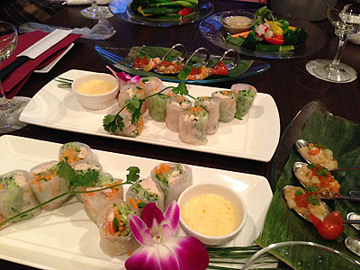 野菜たっぷり3種のヘルシー生春巻きをマンゴーチリソースに付けて頂き。