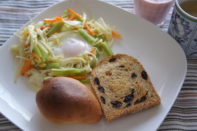 おかずは、ミックス野菜の巣篭り卵。