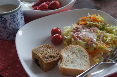 巣篭り卵は、人参とキャベツの他にハムを散らして。