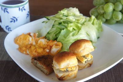 今月のパン教室のお豆腐パンを使っての朝食。