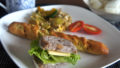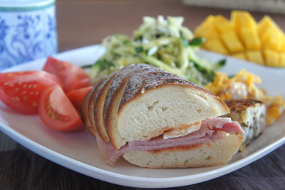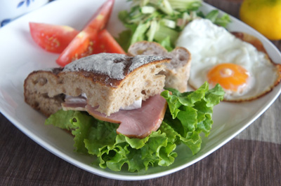 冒頭は、ライ麦の大きく平べったい丸いパンをサンドウィッチに。