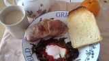 カリカリベーコンに炒めた後のフライパンで目玉焼きを作り、トーストの上にベビーリーフ、ベーコン、目玉焼きを乗せ、ドレッシングだったりお醤油だったり塩胡椒だったり好きなものを掛けて食べるというものです。