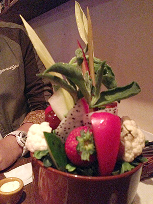 注文を済ませ、飲み物が来て、ややあってチーズのディップが運ばれ「お通し出ますね」と云われたその直後にやってきたのがこのお野菜の鉢!