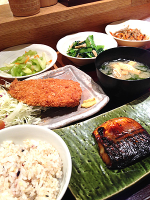 日替わりで焼肴と揚げ物が入れ替わり、その他は和風生姜焼きと豆腐と野菜の湯葉あんかけの4種類の中から2つのメインを選べるということで、私はイワシフライとサバ焼魚を選びました。