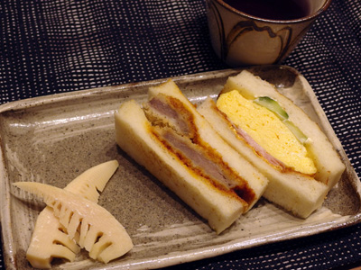 1パックのサンドウィッチを2切れずつと、錦市場で買ってきた京漬物の内、たけのこの浅漬をピクルス代わりに。