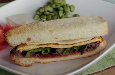 パンをトーストする時に一緒に万願寺もグリルして、チーズや薄焼き卵、ローストビーフと一緒にサンドウィッチにもしてみました。