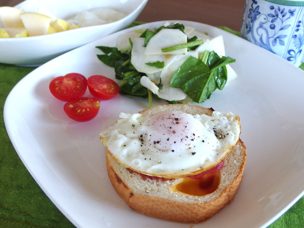 軽くトーストしてチーズがとろりとしたところへ、ケチャップを塗り、目玉焼きを乗せます。