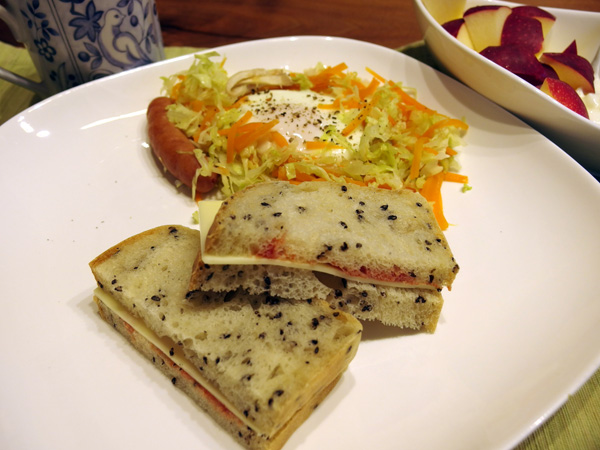 オリーブオイルの黒ごまフランスローフでサンドウィッチの朝食。