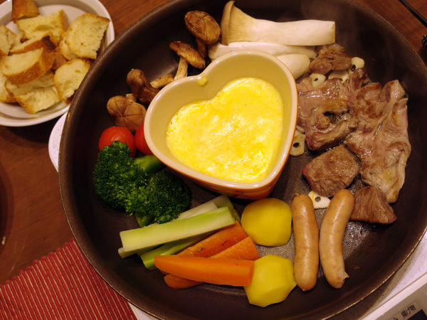 フライパンでは野菜や、ソーセージ、バゲット、そして牛肉や思いつきでラムも焼きながら、チーズ液に浸すという方法。