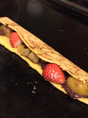 デザートに苺が出てきたので、それも一緒に巻いて、勝手にアレンジ。