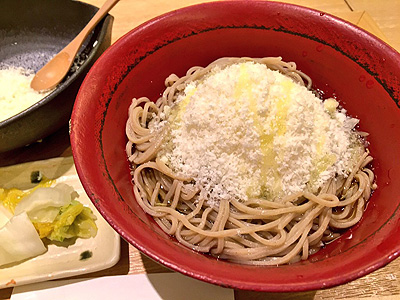冷たいお蕎麦にパルメザンチーズをたっぷりと掛け、オリーブオイルも回しかけて混ぜて食べるというもの。