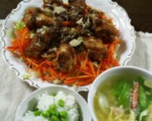 せん切りにしたレタス、軽く電子レンジで茹でた千切りにんじんを敷いた上にチキンを並べ、