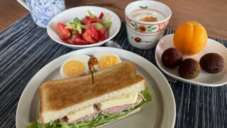 朝食 ハムレタスチーズサンド トーストのサンドウィッチも好きなタイプの朝ごはん。今朝はレタスたっぷり、ハム、チーズは夫のおやつ用のベビーチーズを少しスライスして。果物は、数が中途半... 2025.07.14 朝食