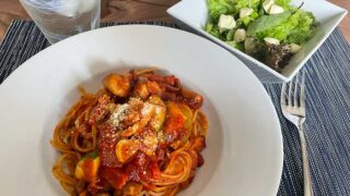 昼食 夏野菜のトマトパスタ バジル風味のトマトのパスタソースでお昼ご飯。燻製の香りが強いベーコン、ズッキーニ、ナスを加えて具沢山のトマトパスタ。あとはグリーンサラダにチーズのトッ... 2025.07.19 昼食